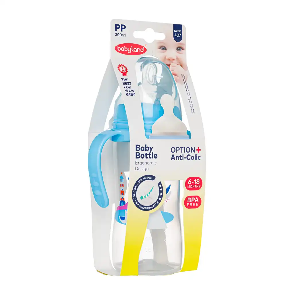 بی بی لند شیشه شیر (شیر خوری) ضد نفخ (آنتی کولیک) دهانه عریض ارتودنسی دسته دار مناسب نوزادان 6 تا 18 ماه 300 میلی – کد 407
